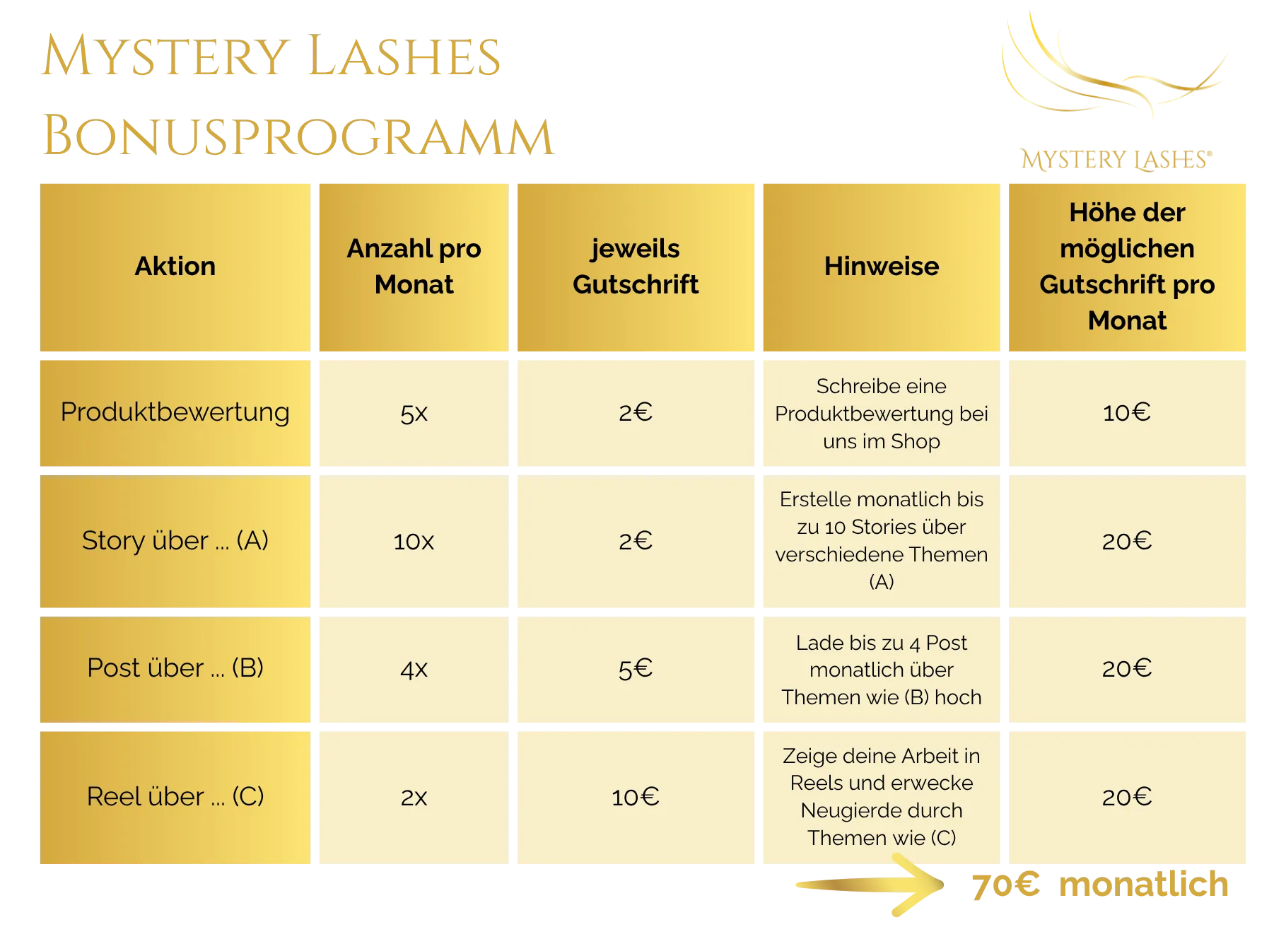 Du kannst bis zu 70 € im Monat sammeln – die Gutschrift erfolgt auf dein Kundenkonto zum Ende des Monats und kann beim nächsten Einkauf bei uns eingelöst werden. Gutschriften sind nicht bar auszahlbar, aber vollständig auf Produkte & Bestellungen bei Mystery Lashes anrechenbar